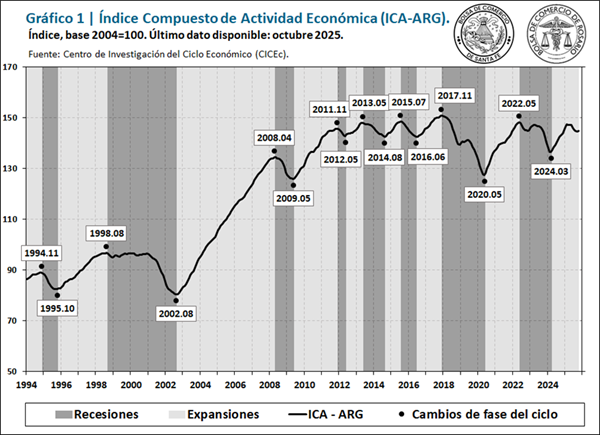 Desde el valle de marzo de 2024 transcurrieron diecinueve meses, de los cuales en los primeros once se observó una recuperación continua, en los siguientes siete frenó esa expansión y el último mes nuevamente se evidencia una recuperación mensual. De esta manera, el ICA-ARG se ubica en octubre un 6,1% por encima de dicho mínimo, aunque un 1,8% por debajo del máximo relativo de febrero, dando cuenta del deterioro observado entre marzo y septiembre.