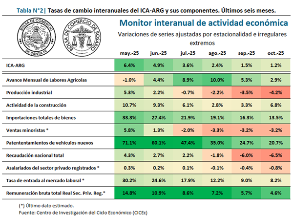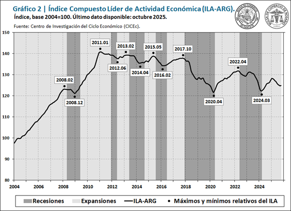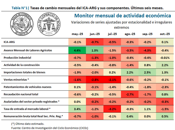 Por su parte, el Índice Compuesto Líder de Actividad de Argentina (ILA-ARG) interrumpió una seguidilla de siete meses consecutivos de deterioro, con una variación levemente positiva en octubre, del 0,02%.