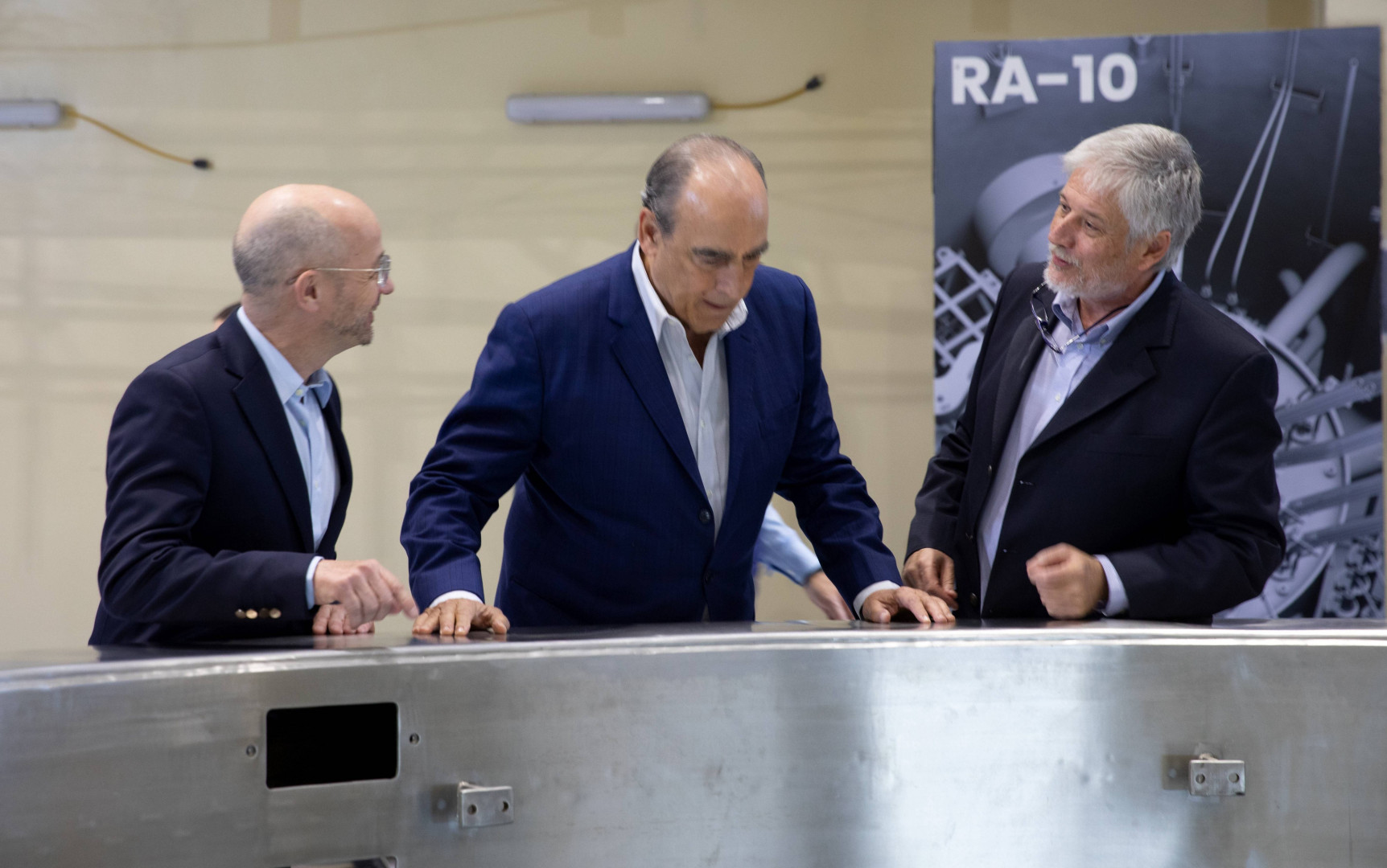 El presidente de la Comisión Nacional de Energía Atómica, Dr. Ing. Germán Guido Lavalle, recibió en la mañana de este viernes al jefe de Gabinete de Ministros, Guillermo Francos, y al vicejefe José Rolandi, con motivo de la instalación del tanque reflector en el Reactor Multipropósito RA-10. Junto con autoridades nacionales, de la CNEA y de las empresas del sector nuclear, recorrieron en el Centro Atómico Ezeiza las instalaciones del que será el reactor productor de radioisótopos más grande de América Latina.