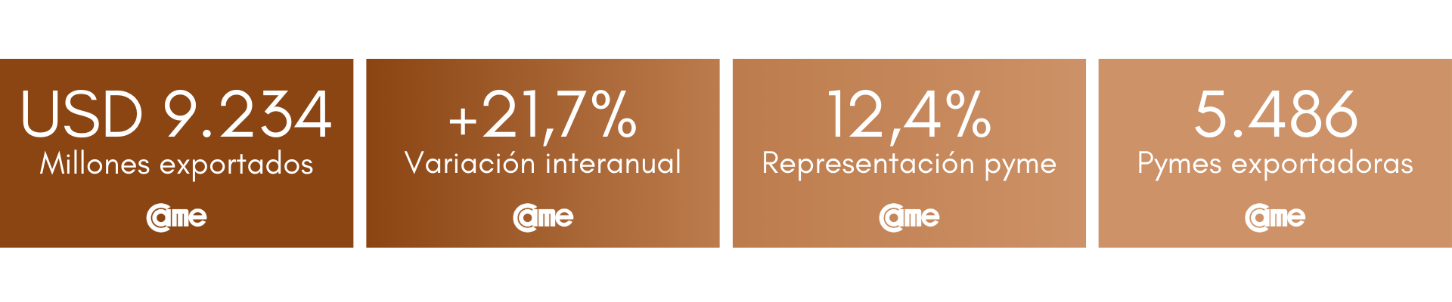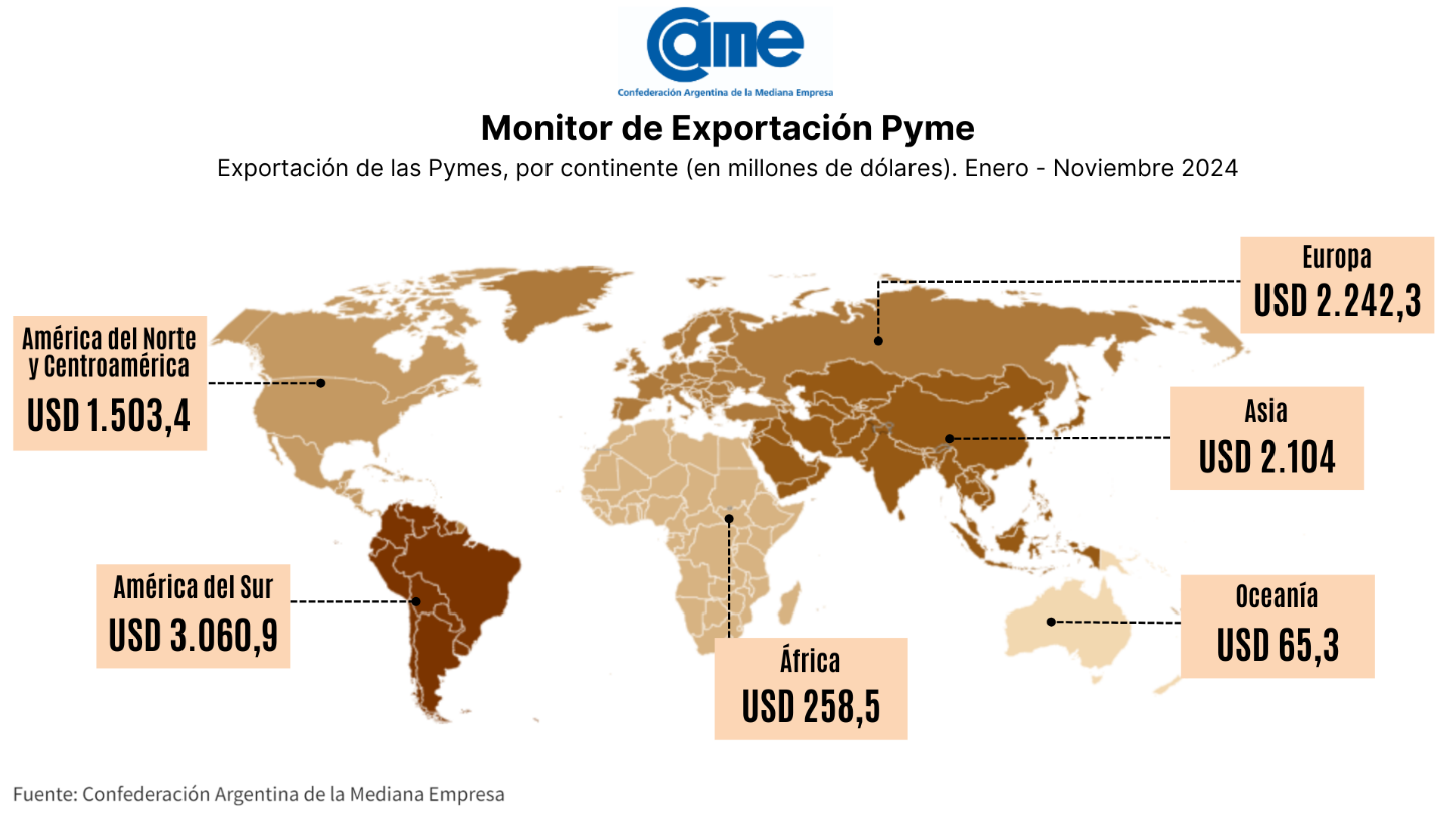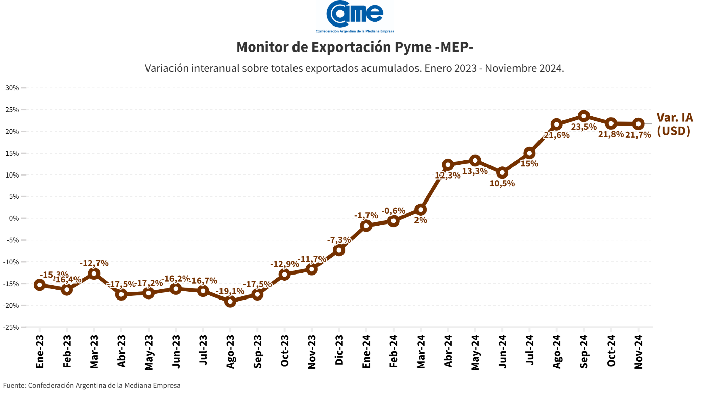Las exportaciones de las empresas pymes crecieron 21,7%, alcanzando los USD 9.234 millones exportados, lo que representa el 12,4% del total exportado por la Argentina en el período enero–noviembre 2024, según informe de la Confederación Argentina de la Mediana Empresa (CAME).