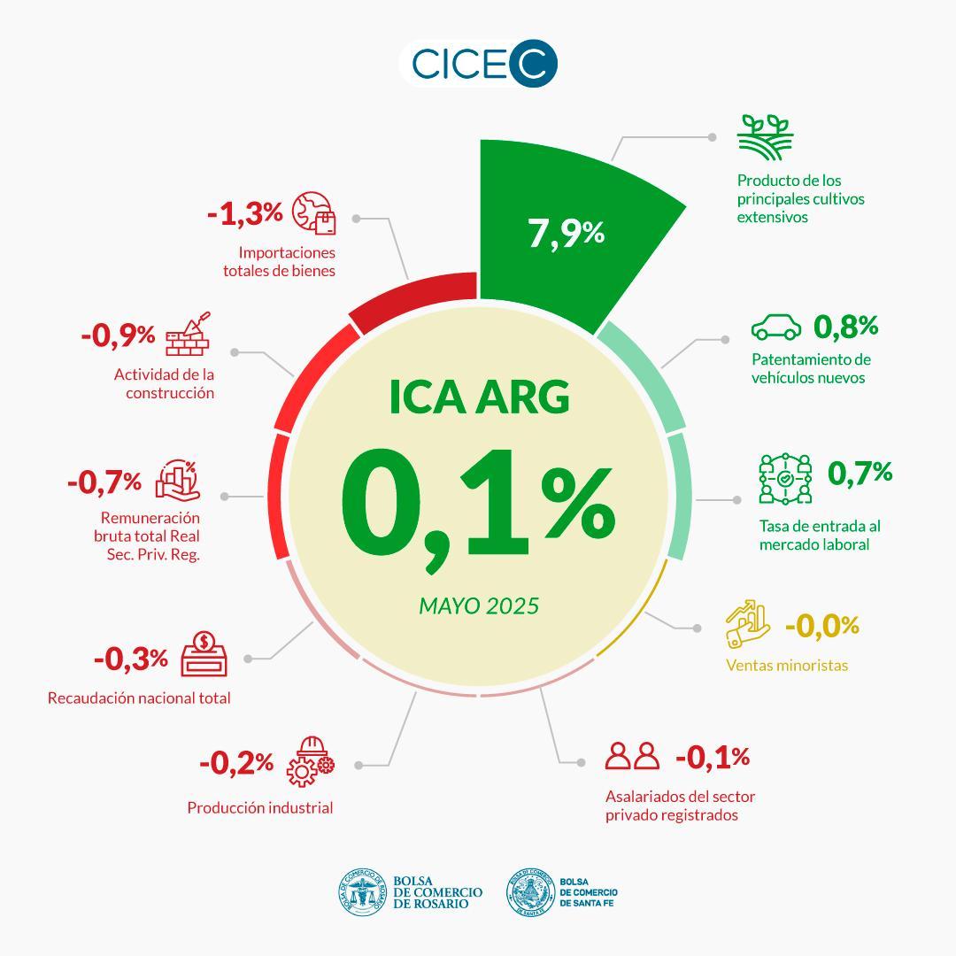 Según un reciente informe del Centro de Investigación del Ciclo Económico (CICEc), integrado por las Bolsas de Comercio de Rosario y Santa Fe, el Índice Compuesto Coincidente de Actividad Económica de Argentina (ICA-ARG) presentó en mayo de 2025 una variación mensual positiva del 0,1%. En la comparación interanual, el indicador mostró un incremento del 6%, aunque se mantiene la tendencia hacia un ritmo de recuperación más lento. El informe destaca que el desempeño de la economía en mayo se dio en un contexto global adverso, marcado por tensiones comerciales y ajustes monetarios. A nivel local, el primer mes completo bajo el nuevo esquema cambiario introdujo un escenario de transición, con impacto dispar entre los distintos sectores. De los diez componentes que integran el índice, solo cuatro registraron subas en el mes. Entre ellos se destaca el producto de los principales cultivos extensivos, que creció 7,9% mensual, impulsado por el avance de la cosecha. También aumentaron los patentamientos de vehículos nuevos (0,8%), que alcanzaron su mayor nivel desde 2018, y la tasa de entrada al mercado laboral (0,7%). En cambio, la industria cayó un 0,2%, las importaciones retrocedieron 1,3% y la construcción bajó 0,9%, cortando una racha de seis meses consecutivos en alza. |