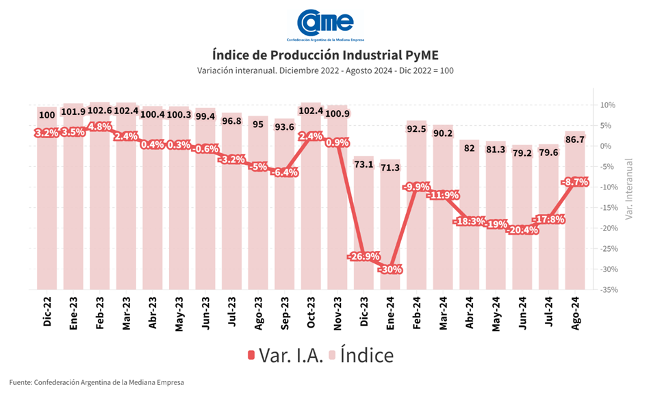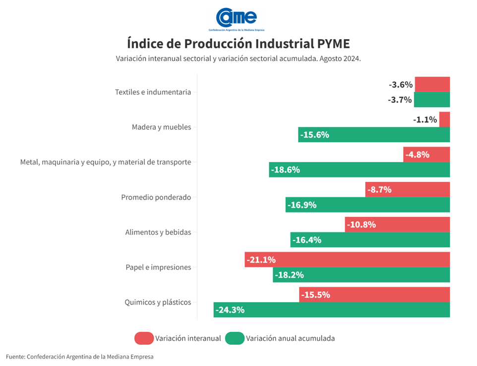 La actividad manufacturera de las pymes descendió 8,7% interanual en agosto y acumula una retracción de 16,9% en los primeros ocho meses del año frente al mismo periodo de 2023, según informe la Confederación Argentina de la Mediana Empresa (CAME). Las industrias pymes aún no muestran señales firmes como para afirmar la existencia de un cambio de tendencia o de reactivación, más que algunos focos los cuales van siendo aleatorios mes a mes.