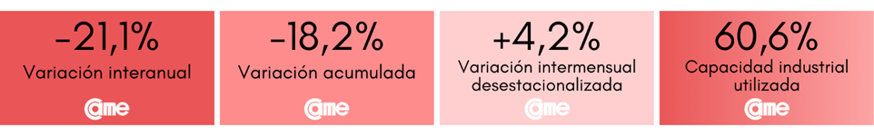 En agosto, el ramo experimentó una significativa contracción del 15,5% anual, siempre a precios constantes, y un repunte de 2,1% en la comparación mensual. Para los primeros ocho meses del año, la caída acumulada es de 24,3%. Durante este mes, las industrias operaron con apenas 57,3% de su capacidad instalada, son 3,2 puntos por debajo de julio (60,5%).