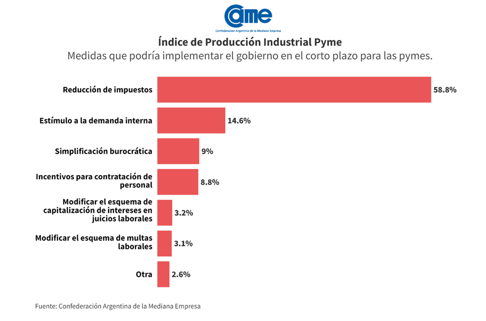 La medida más destacada que esperan en las industrias pymes en el corto plazo es la reducción de impuestos, que representa 58,8% de las respuestas, seguida por el estímulo a la demanda interna con 14,6%. La importancia de simplificar regulaciones y trámites ocupó el tercer lugar con un 9% de las respuestas. A su vez, la generación de incentivos para la contratación de personal se lleva el cuarto lugar con 8,8%, lo que marca el incremento en el peso que tiene el componente laboral en la empresa.