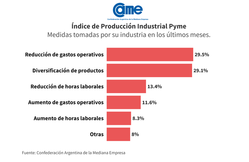 En cuanto a la principal medida tomada en agosto para afrontar la coyuntura, se destaca la reducción de los gastos operativos con 29,5% de las respuestas, seguido por la diversificación de productos con 29,1% y la reducción de horas laborales (13,4%).