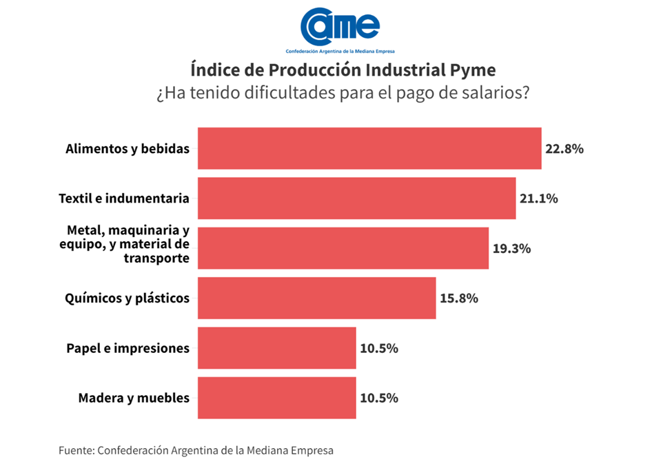 Por último, en diferentes sectores industriales se consultó si la pyme tuvo dificultades para afrontar el pago de salarios del mes en curso. Allí, el 16,7% de las firmas presentaron problemas para pagar salarios (sin incluir aguinaldo u otros conceptos) unos 2,6 puntos porcentuales menos que el mes pasado. Los sectores más afectados fueron “Alimentos y bebidas” y “Textil e indumentaria” con tasas de dificultades del orden del 22,8% y 21,1%, respectivamente.