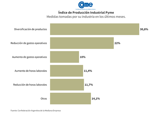 Frente a este contexto, muchas empresas han optado por medidas internas para amortiguar el impacto de la coyuntura. La estrategia más utilizada ha sido la diversificación de productos, aplicada por el 30,8% de las pymes, lo que permitió a las firmas explorar nuevos mercados y compensar la baja demanda en segmentos tradicionales. La reducción de gastos operativos también ha sido clave para el 22% de las industrias, con ajustes en costos logísticos y mejoras en eficiencia interna. Sin embargo, en ciertos casos, la única alternativa ha sido aumentar gastos operativos o extender las horas laborales para mantener la producción activa, lo que expone la tensión que viven muchas empresas para no perder mercado.