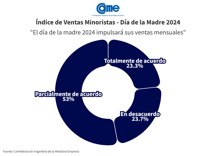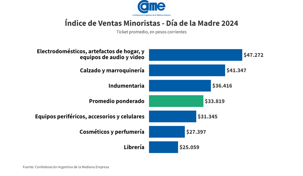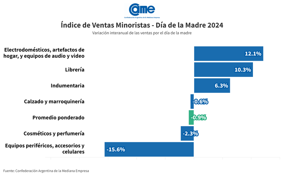 Las ventas de los comercios minoristas pymes por el Día de la Madre registraron una caída del 0,9% en comparación con el mismo período del año anterior, a precios constantes. Esta es la tercera disminución anual consecutiva (3,2% en 2023 y 4,7% en 2022), reflejando el impacto del menor poder adquisitivo de las familias, según un informe de la Cámara Argentina de la Mediana Empresa (CAME).
