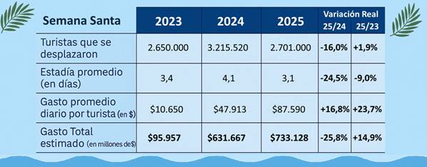 Los resultados del fin de semana fueron moderados, aunque dentro de lo previsto. Comparados con 2024, resultaron inferiores, porque Semana Santa del año pasado tuvo 6 días, al combinarse con el feriado por el Día del Veterano y de los Caídos en la Guerra de Malvinas. Por eso la cantidad de turistas este año bajó 16% y el impacto económico resultó menor.